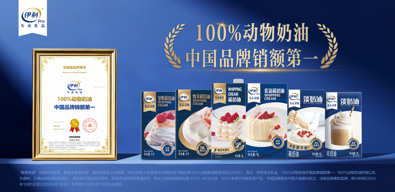 这份对品质的坚守赢得了市场的回响。凭借卓越的产品力与市场表现,伊利专业乳品荣获权威调研机构尚普咨询颁发的"100%动物奶油中国品牌销额第一"市场地位证明。这不仅是一份荣誉,更是市场对健康与品质双重期待的有力回应。