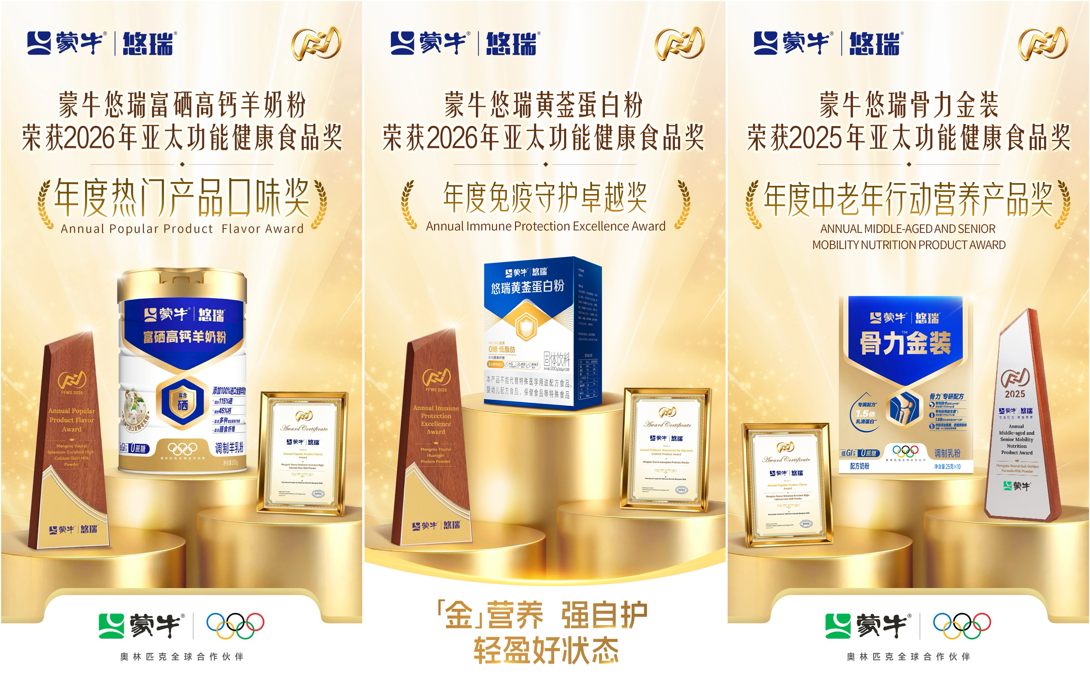 就在不久前,蒙牛悠瑞富硒高钙羊奶粉斩获2026年亚太功能食品健康峰会“年度热门产品口味奖”,蒙牛悠瑞黄菳蛋白粉则斩获“年度免疫守护卓越奖”。据悉,其标杆产品“悠瑞骨力金装”的卓越功效早已获得行业高度认可——早在2025年便荣获“亚太功能健康食品奖-年度中老年行动营养产品奖”。系列奖项的获得,标志着蒙牛悠瑞在产品力上构建了深厚的护城河。